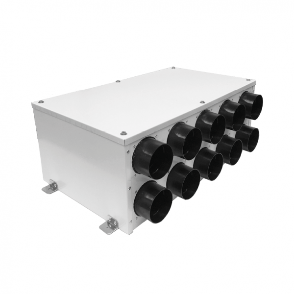 Horganyzott acéllemezből készült központi hővisszanyerős szellőztető rendszereknél alkalmazható osztó - gyűjtő elem 1 db 150 mm-es átmérőjű csőcsatlakozással és 10 db 75 mm átmérőjű csatlakozással, akusztikus szigeteléssel. A 150 mm-es csatlakozás a központi szellőztető készülékkel köthető össze ugyanilyen átmérőjű légtechnikai csővel, a kisebb méretű csatlakozási pontokat az egyes befúvási vagy elszívási pontokkal köthetők össze 75 mm külső átmérővel rendelkező, a kívánt méretben méretre vágott antibakteriális és antisztatikus légtechnikai csövekkel. Ez az osztóelem maximum 10 szellőztetési pont kialakítását teszi lehetővé.