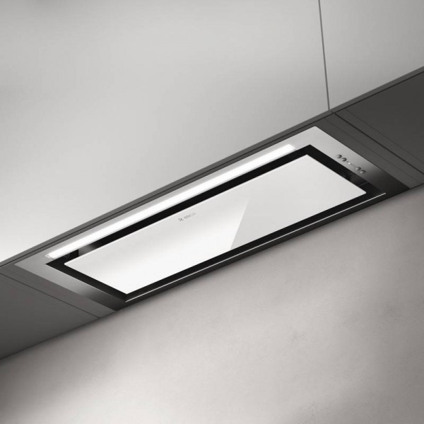 Diszkrét, rejtett páraelszívó, rozsdamentes acél, fekete matt és rozsdamentes acél/fehér üveg kivitelben, szórt LED-világítással.