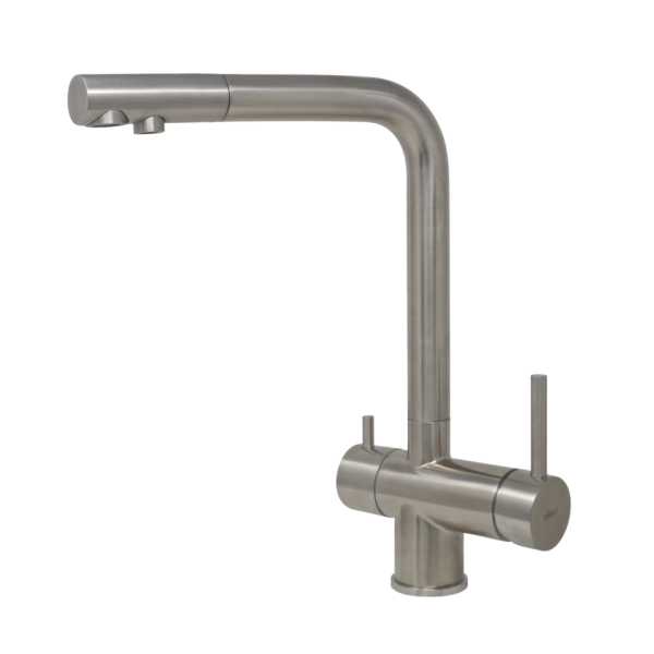 Egykaros álló csaptelep, két elosztó szeleppel, kerámiabetéttel, oldalsó szabályzókkal, elforgatható kifolyócsővel, víztisztító rendszerekhez is alkalmazható.