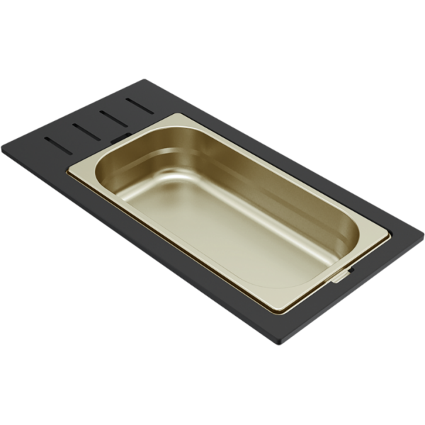 ELLECI gourmet kitEgyrészes aluminíum tároló edény fekete HPL kerettel, arany színben. Használható SINTESI 510, 480, 410 mosogatókhoz.