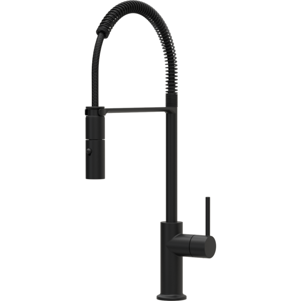 Egykaros félprofesszionális, ívelt, magas, kerámiabetétes csaptelep, oldalsó szabályzóval, forgatható kifolyócsővel, flexibilis zuhanyfejjel, normál beépítéssel, Ø35 mm-es furattal. 3-féle színben rendelhető.