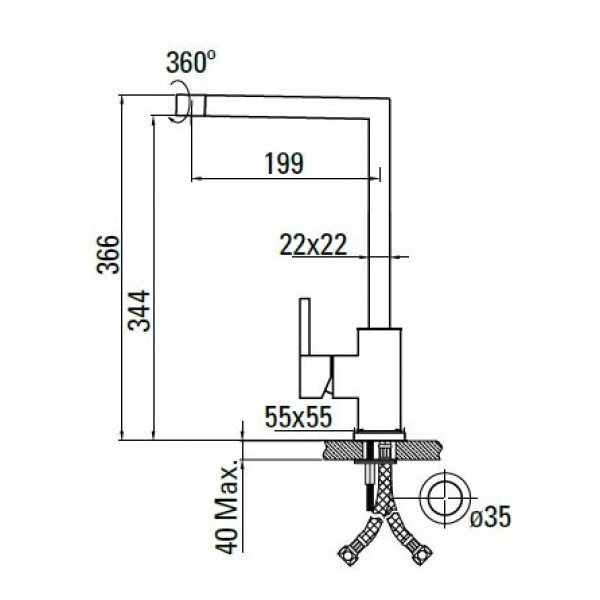 Rozsdamentes acél csaptelep, 360º-ban forgatható “L” alakú csaptelep, Vízpermetes mechanizmus, Kerámiabetét, Flexibilis bekötőcső, Elforgatható fej